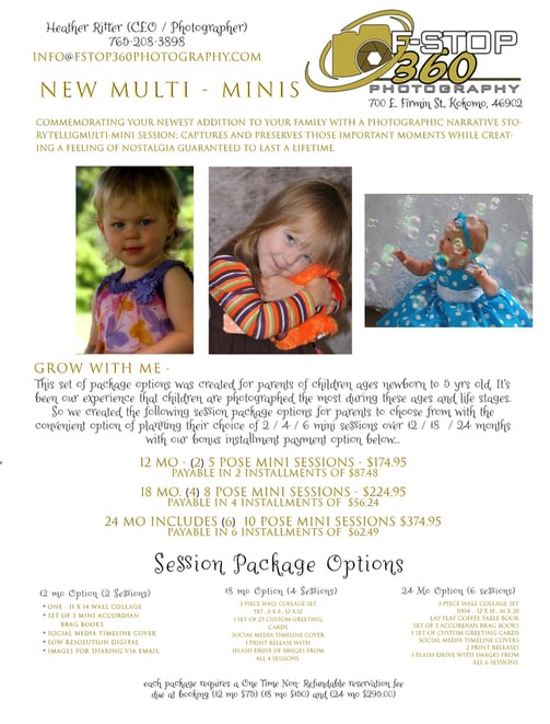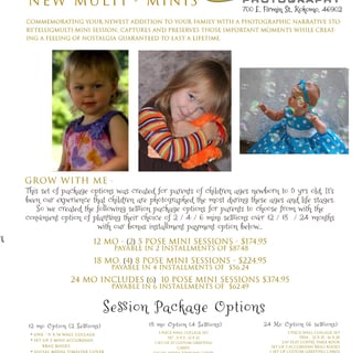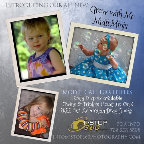 We are excited to announce that we have 5 spots available for little ones aged from birth to 5 years old for our all-new "Grow With Me" multi mini sessions! Parents can create their own group of 3 portrait sessions tailored specifically for their child. These sessions provide a wonderful opportunity to capture precious milestones and memories during those early years. Some of our fun and engaging themed options include "Meet the Grandparents," "My 1st Haircut," and milestones like "1st/Last Day of Preschool/Kindergarten." Don’t miss out on this unique chance to document your child's growth in a fun and unique way! Reserve your spot today!